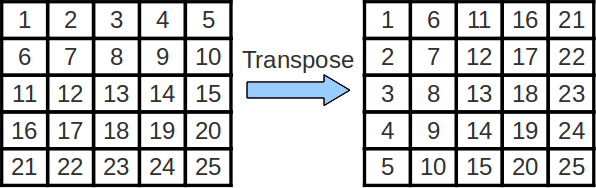 Sometimes, we wish to swap the rows and columns of a matrix. This operation is called a "transposition" and an efficient implementation can be quite helpful while performing more complicated linear algebra operations. The transpose of matrix A is often denoted as AT.
