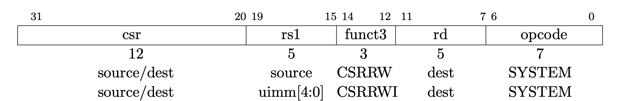 | csrwi rd, csr, uimm | 0x5 | CSR[csr] ← {uimm} |
