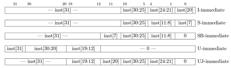 The Immediate Generator ("Imm Gen") unit (located in imm-gen.circ) extracts the appropriate immediate from I, S, B, U, and J type instructions. Remember that in RISC-V, all immediates that leave the immediate generator are 32-bits and sign-extended! See the table below for how each immediate should be formatted: